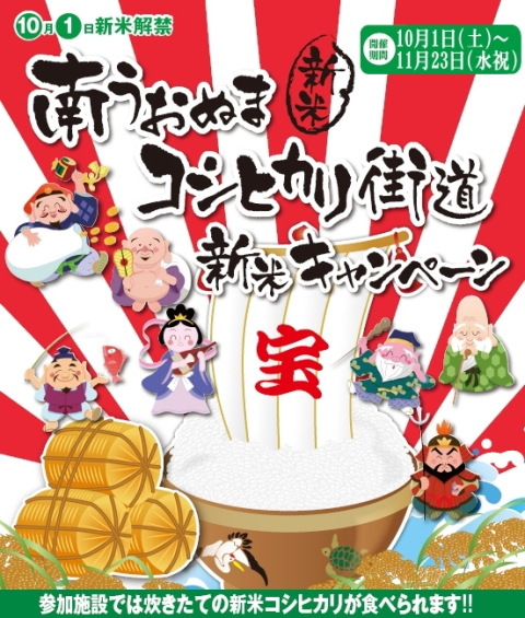 新米キャンペーン中のイベントとしては、既に八色の森公園での八色の森市民まつり、関越道・塩沢石打下りSAでのぬか釜ごはん無料試食などが行われていますが、これ以後も、11月8日まで八海山ロープウェイにて魚沼きのこ汁と新米おにぎりフェアや、11月3日のコメリンピック09がしおざわ産業まつりの一環として今泉博物館前広場で開催されます。